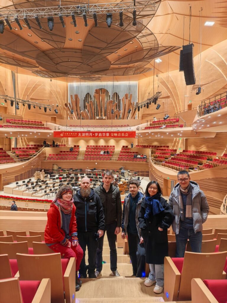 Rieger organ and Rieger crew in the new concert hall in Wuxi, with the organ in the background. Courtesy of Shanghai Pi Organ Industrial Ltd.