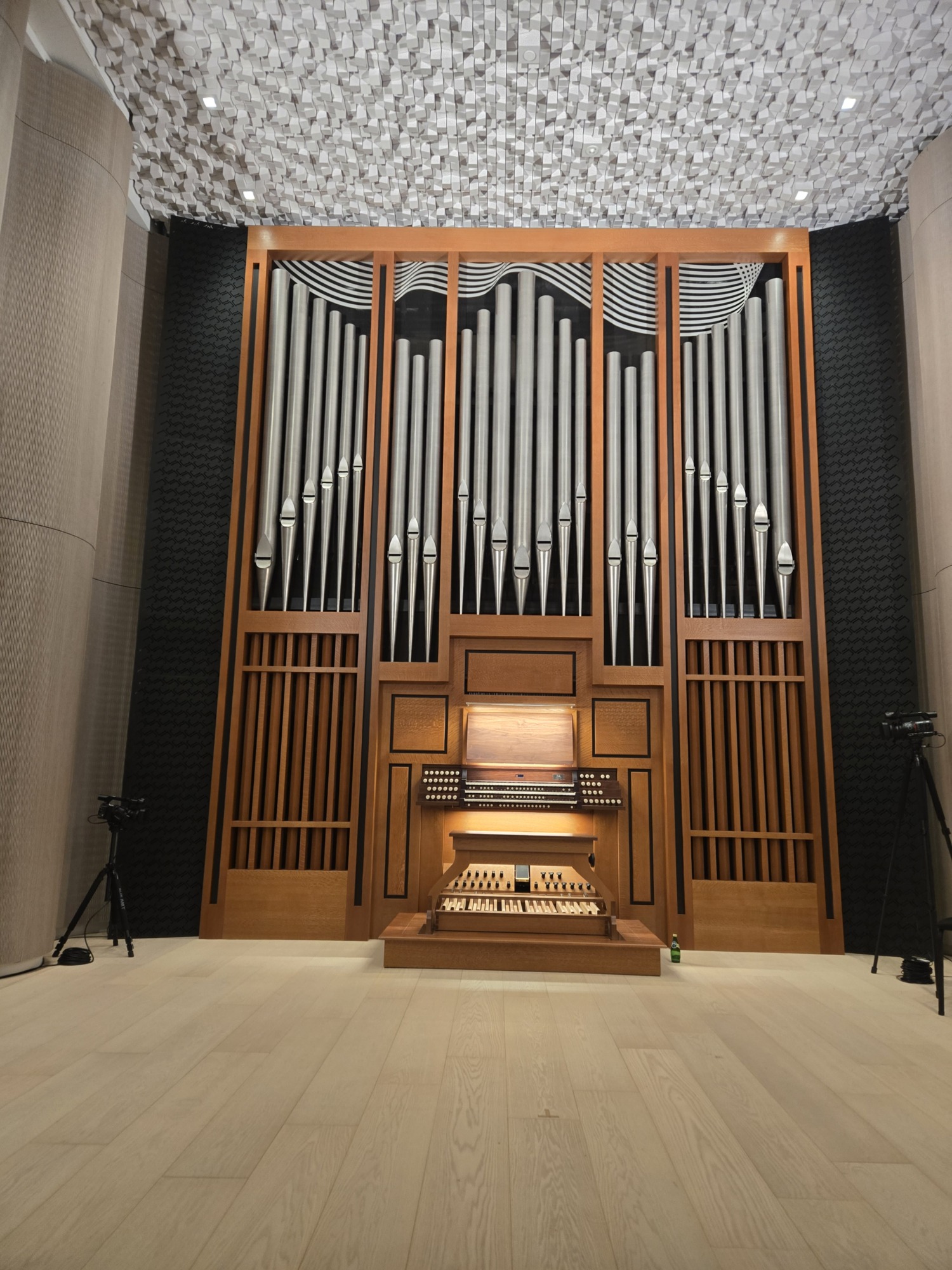 HKG2025b is one of the two new Fisk installations at Hong Kong Baptist University’s Jockey Club Campus of Creativity. It is a three-manual organ with a Baroque Great and Positive, and a French Romantic Swell. The manuals are arranged French-style, from the bottom up I-II-III.