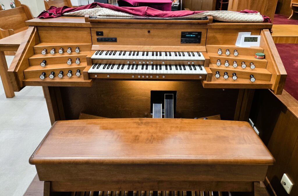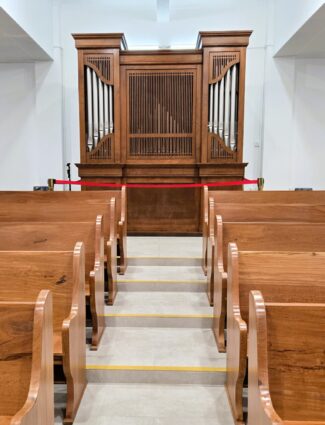 MAC2019 is a Casavant Inspiration model 7-rank unit organ, installed in 2018/19 at the Macau Baptist Church. The sanctuary, in a modern office-style building, is a long rectangle with seating in the upper half raked, as in an auditorium. The Chest is placed a the back of the sanctuary, and the console near the front.